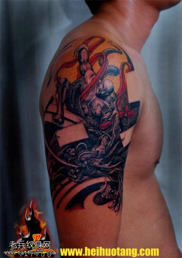 肩部超真实身骑神龙伏龙罗汉纹身图案