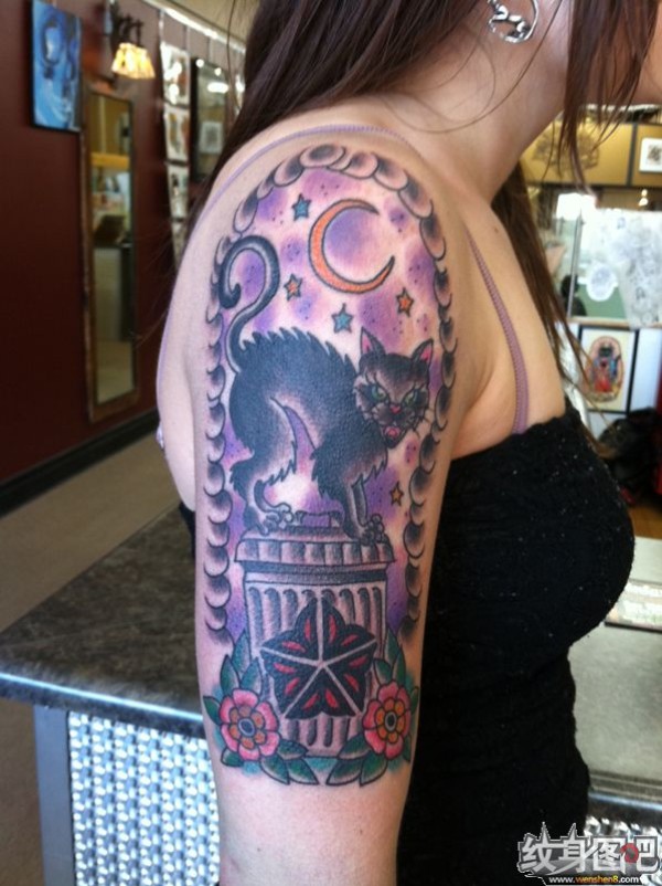 大臂上的一只黑猫纹身