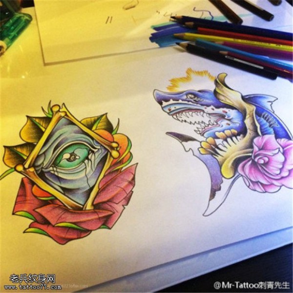 上帝之眼玫瑰花鲨鱼纹身手稿图片