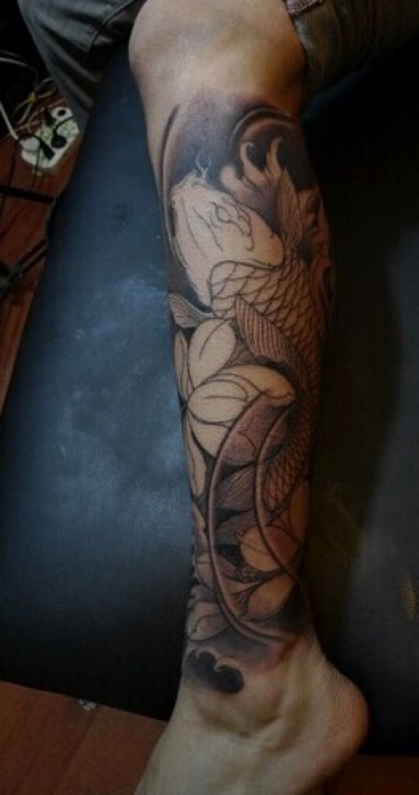 传统鲤鱼花小腿纹身_腿部纹身图案大全_纹身图吧