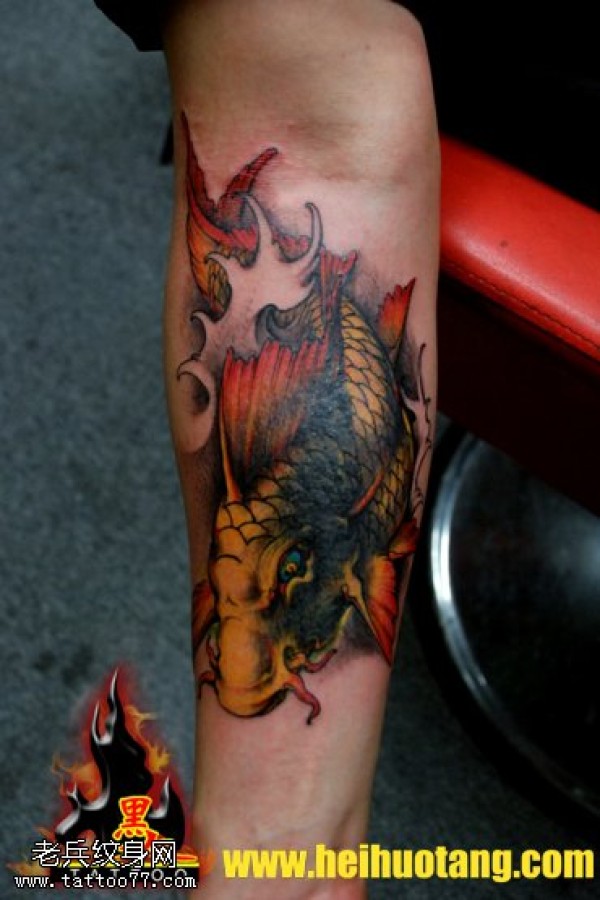 胳膊水纹碧波金色龙鱼纹身图案