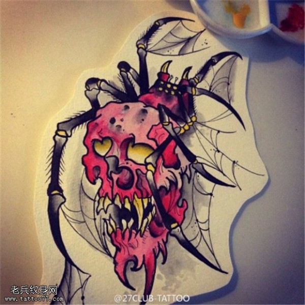 彩色骷髅蜘蛛纹身手稿图案