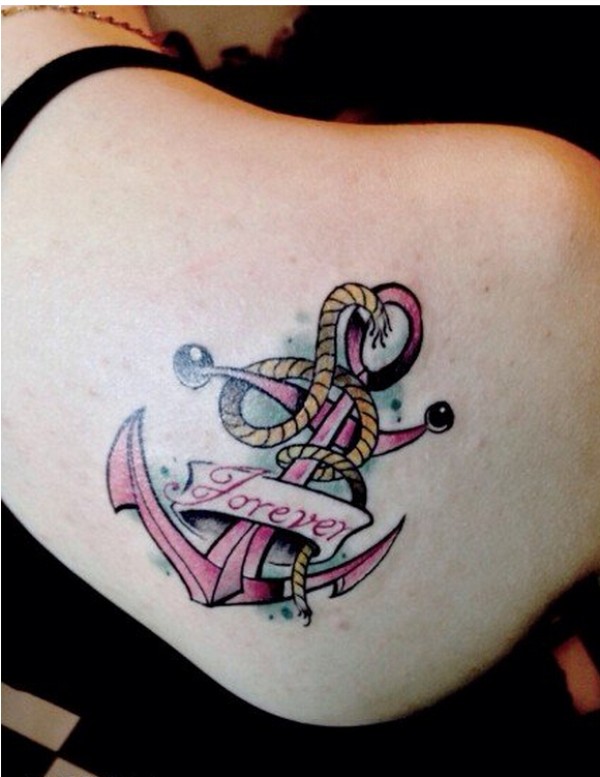 女生背部唯美时尚好看的彩色船锚纹身图片