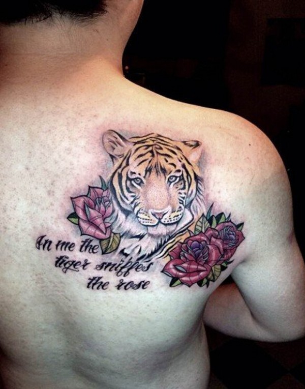 背部时尚好看的彩色老虎玫瑰花纹身图图片