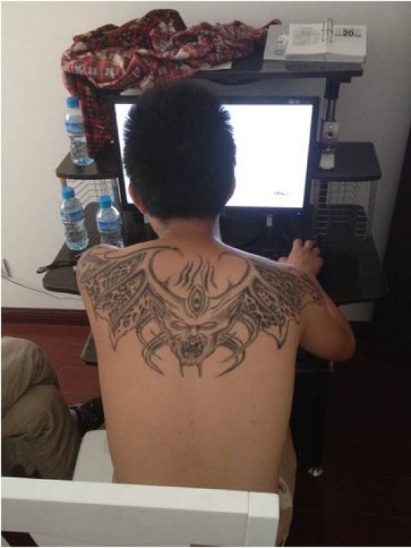 网吧帅哥后背邪恶的蝙蝠纹身图案