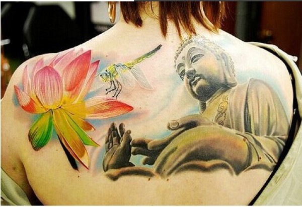 女生后背的佛像纹身,还有荷花与蜻蜓图片