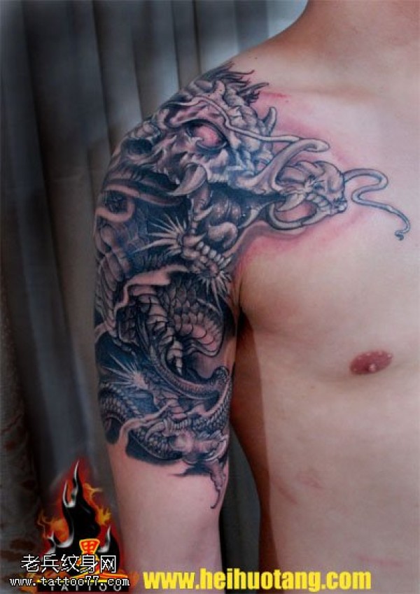 肩部漂浮酷炫中国风墨色龙骷髅纹身图案