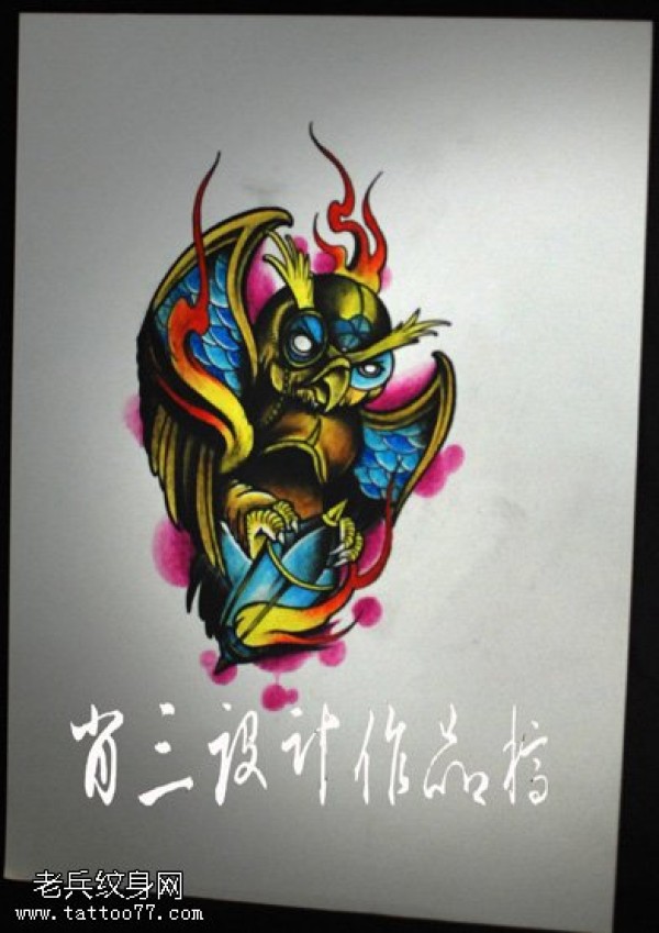 手绘铜石羽翼火焰猫头鹰纹身图案