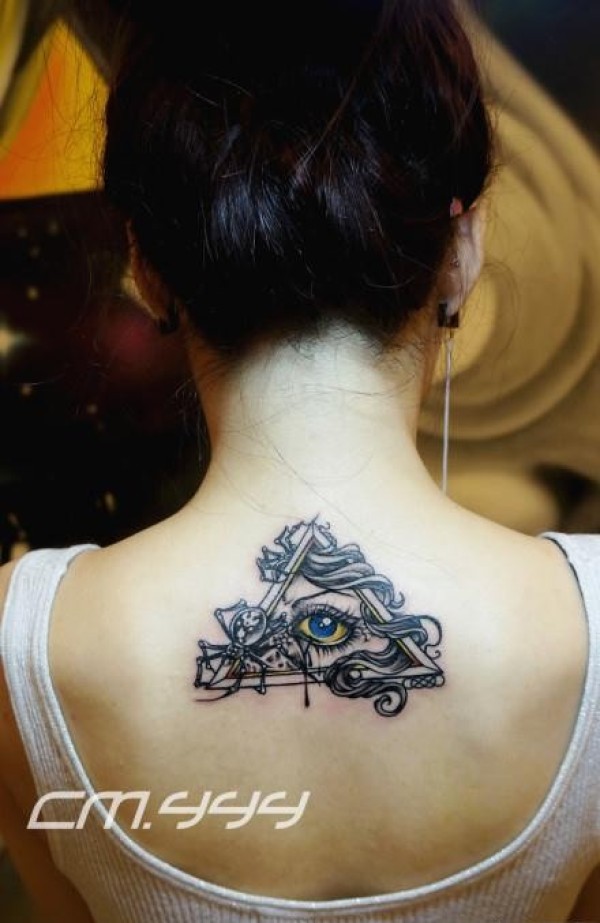 女性后背前卫经典的蜘蛛与眼睛纹身图片