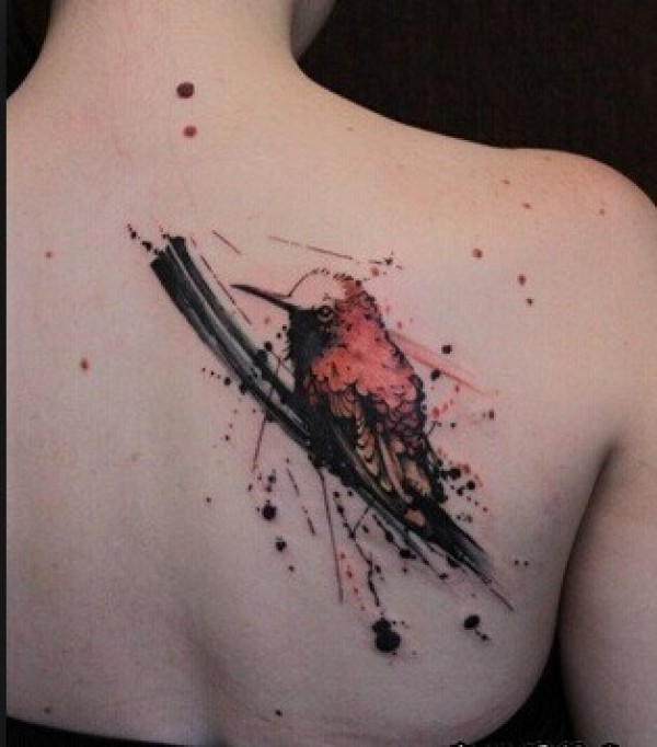 女生后背潮流漂亮的水墨蜂鸟纹身图片