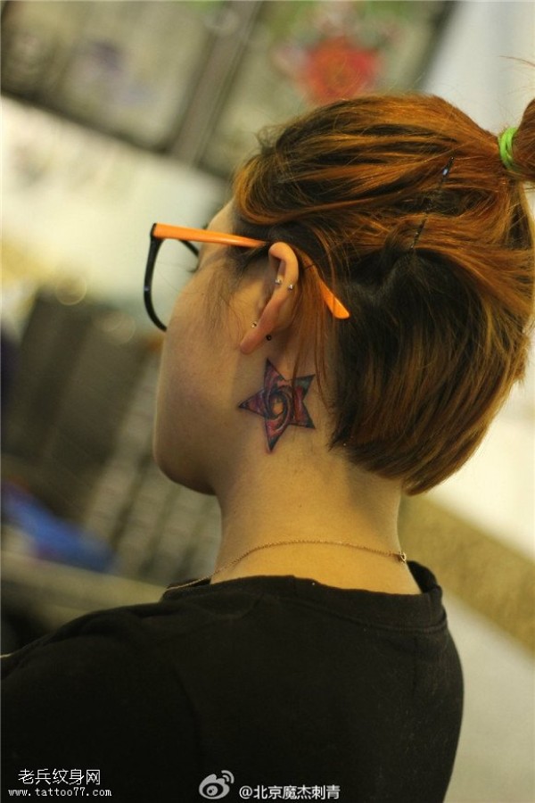 耳后彩色星空五角星纹身图案
