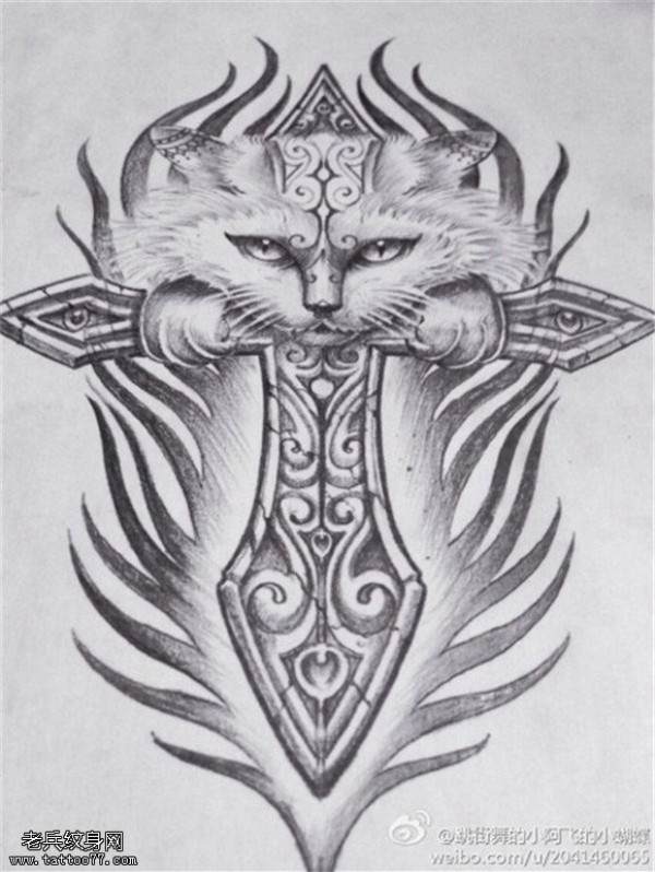 十字架猫咪纹身手稿图片