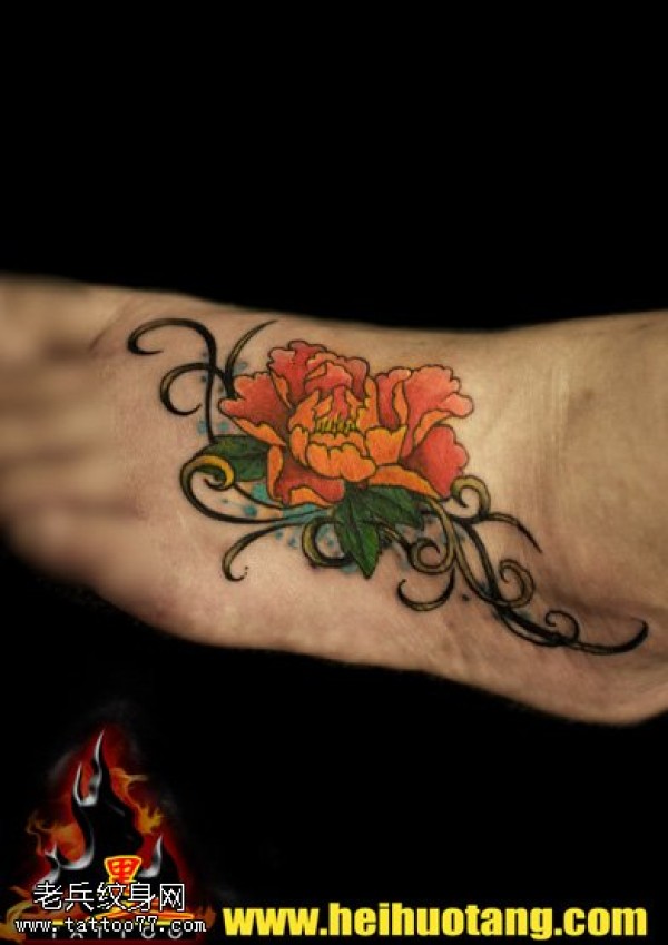 脚部橙色菊花盛开纹身图案