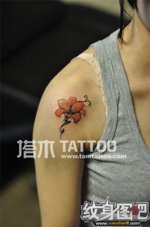 肩膀上一朵娇艳的小红花纹身图案