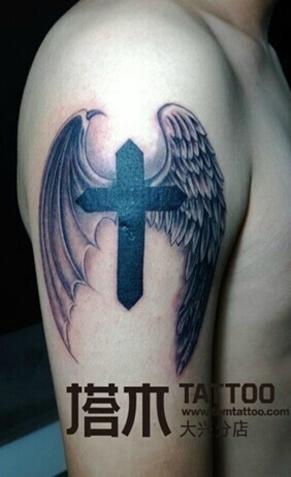 魔鬼天使翅膀十字架纹身
