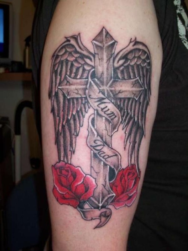 大臂上时尚的十字架纹身
