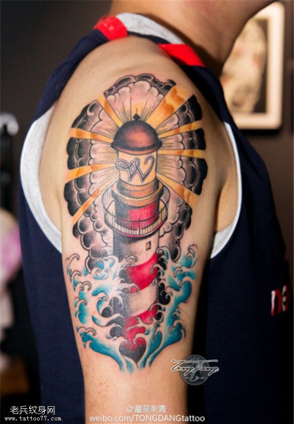 大臂个性彩色灯塔纹身图案