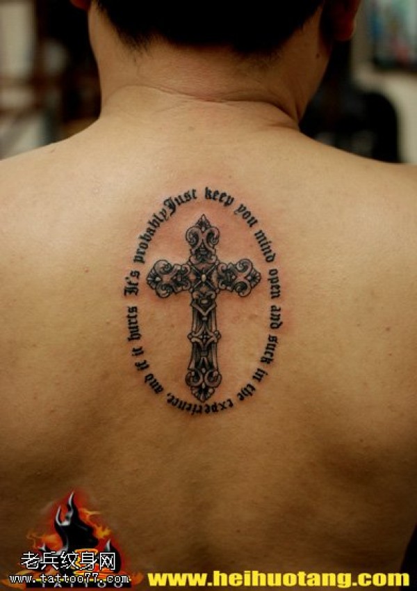 英文花体环绕十字架纹身图案