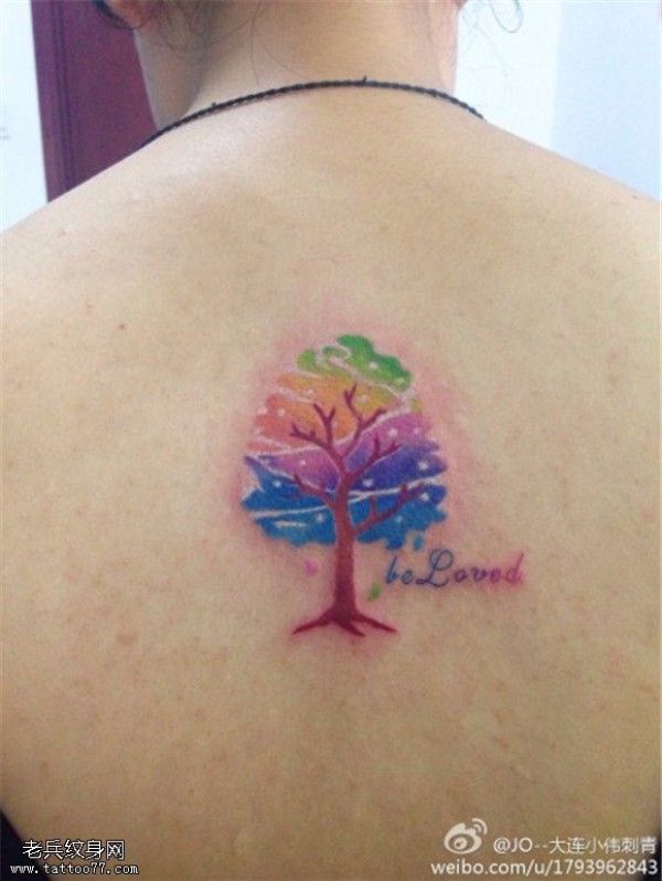 背部彩色树纹身图案