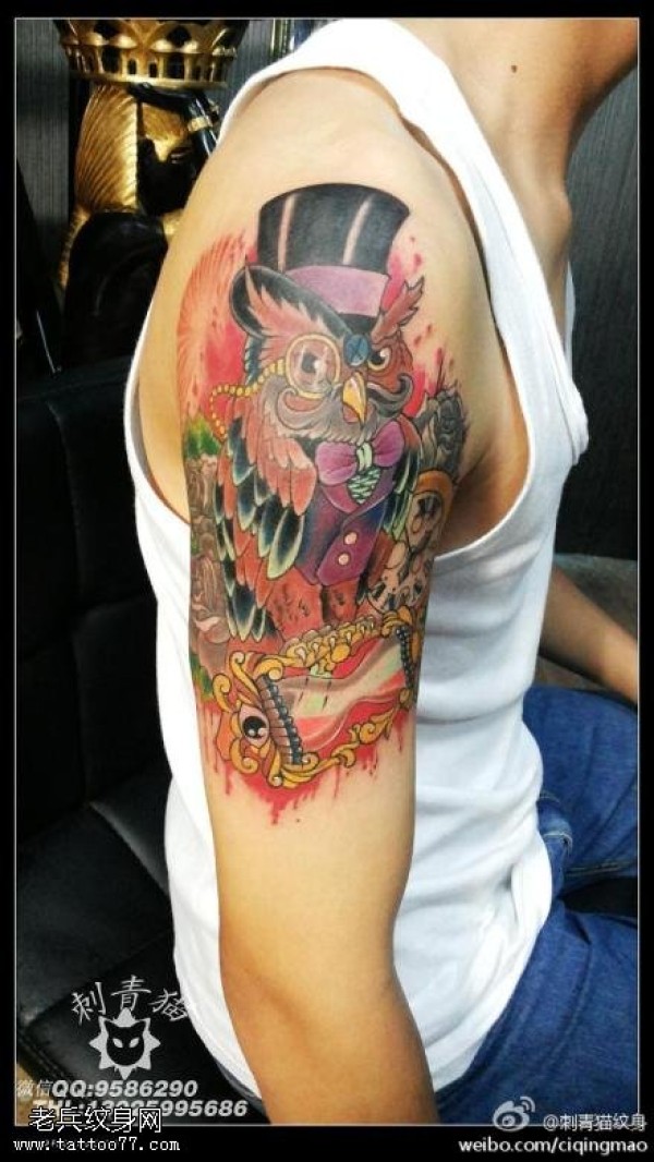 手臂个性彩色猫头鹰纹身图案