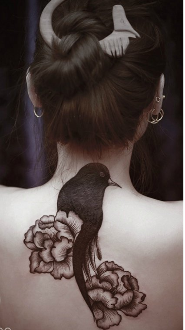 女子背部个性时尚全黑牡丹花乌鸦纹身