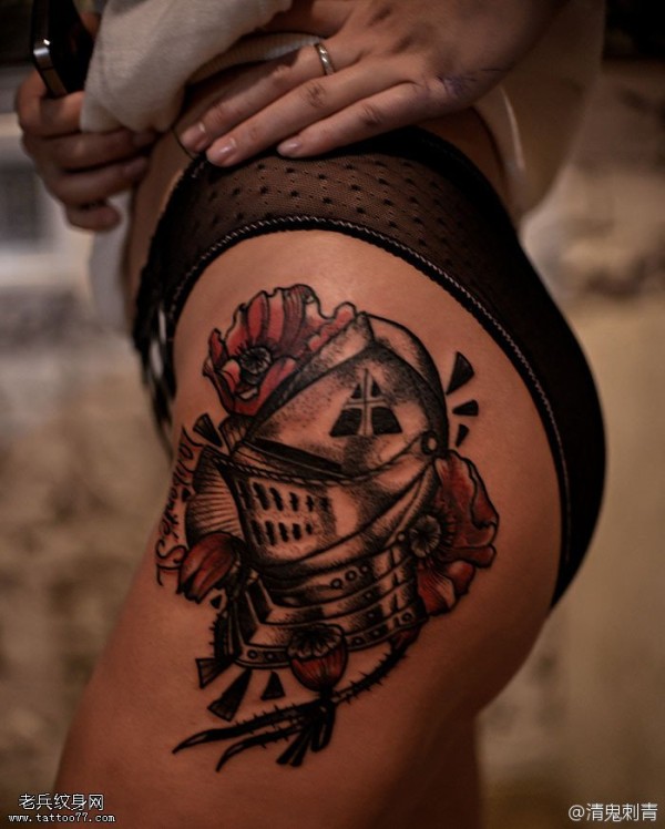 腿部美丽花朵骑士纹身图案