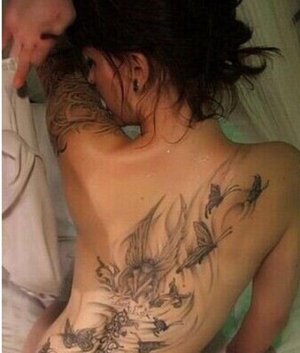 女生性感背部唯美的群舞蝴蝶纹身图案