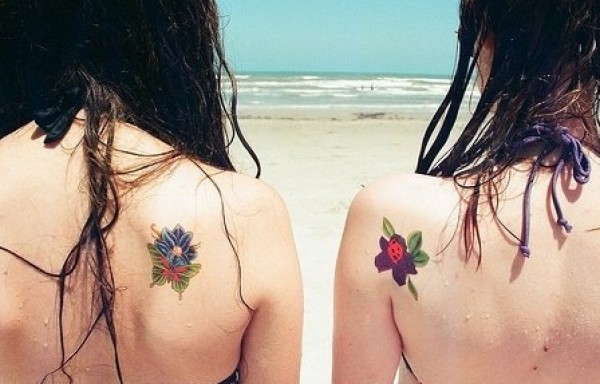 女生背部彩色小花姐妹纹身图案欣赏图片