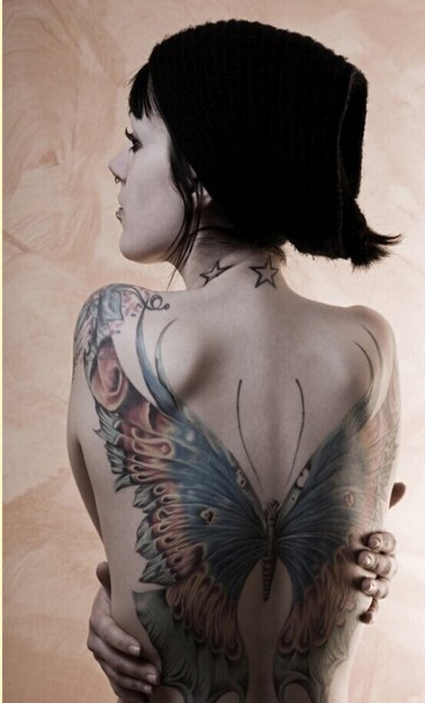 女生背部个性彩色蝴蝶纹身图案欣赏图片