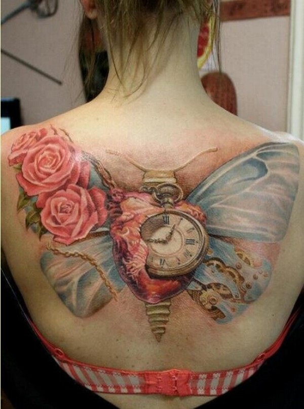 时尚女生背部蝴蝶玫瑰花时钟纹身图案