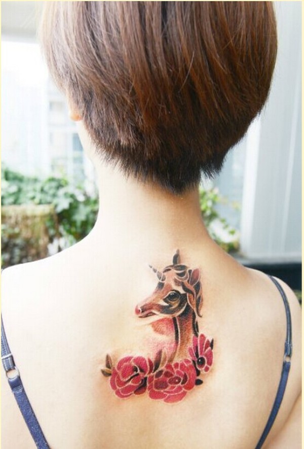 时尚女生背部个性独角兽玫瑰花纹身图图片