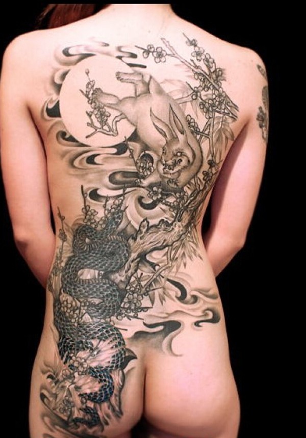 经典时尚满背个性龙与兔子纹身图案