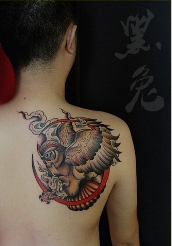 时尚男士背部彩色个性猫头鹰纹身图片图片