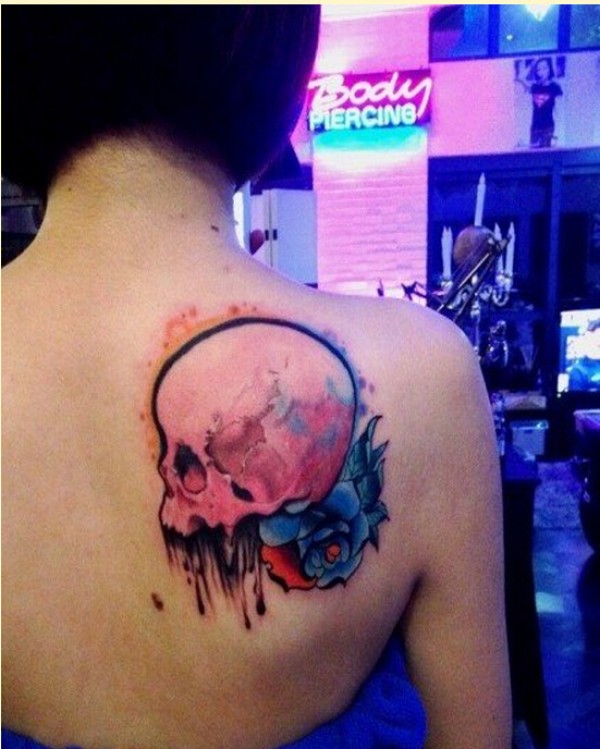 时尚女生背部个性骷髅玫瑰花纹身图案