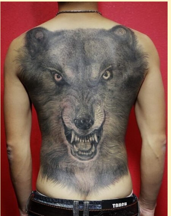 很酷很经典的男生满背狼头纹身图案