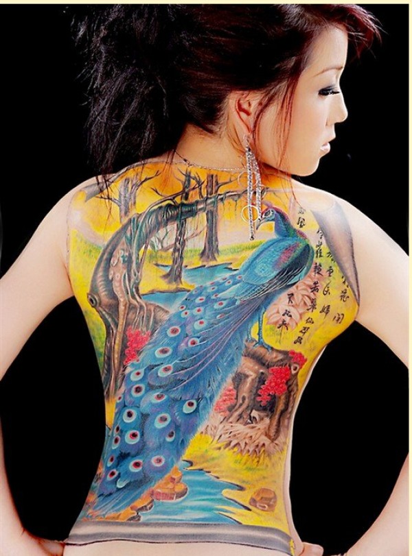 时尚美女满背漂亮好看的孔雀纹身图案