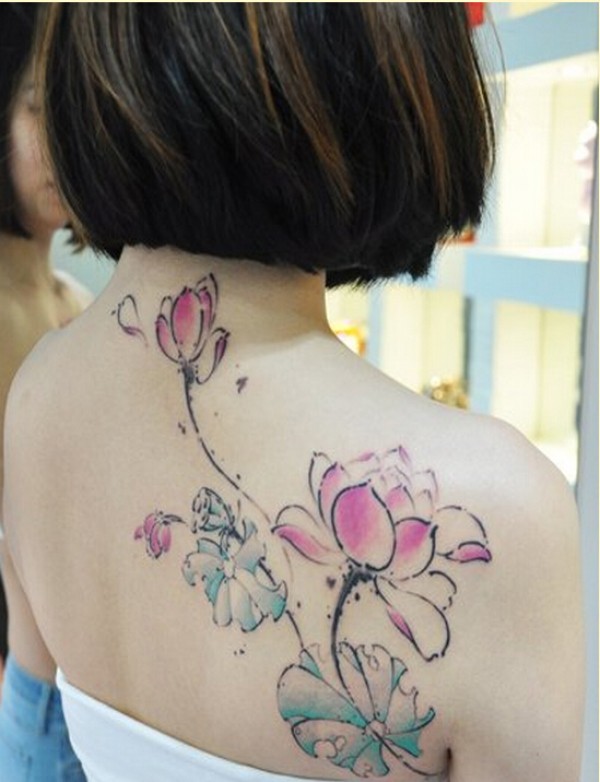 时尚女生背部漂亮的彩色莲花纹身