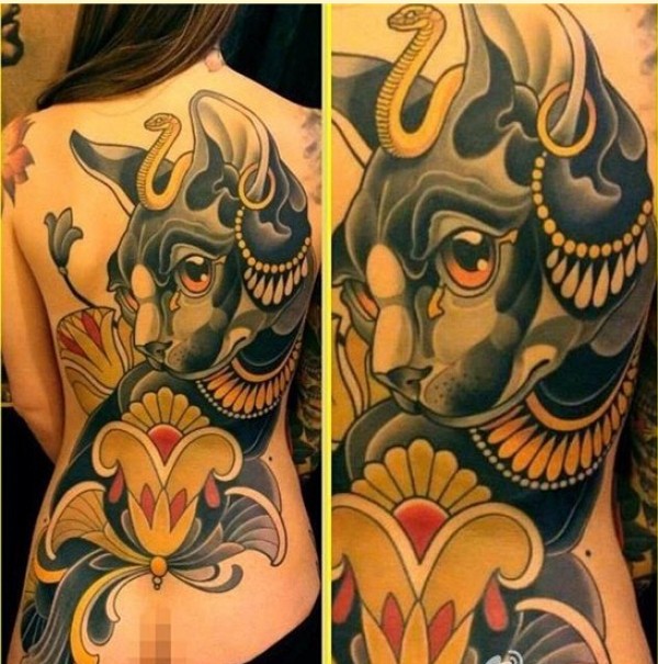 经典时尚女生满背个性猫纹身