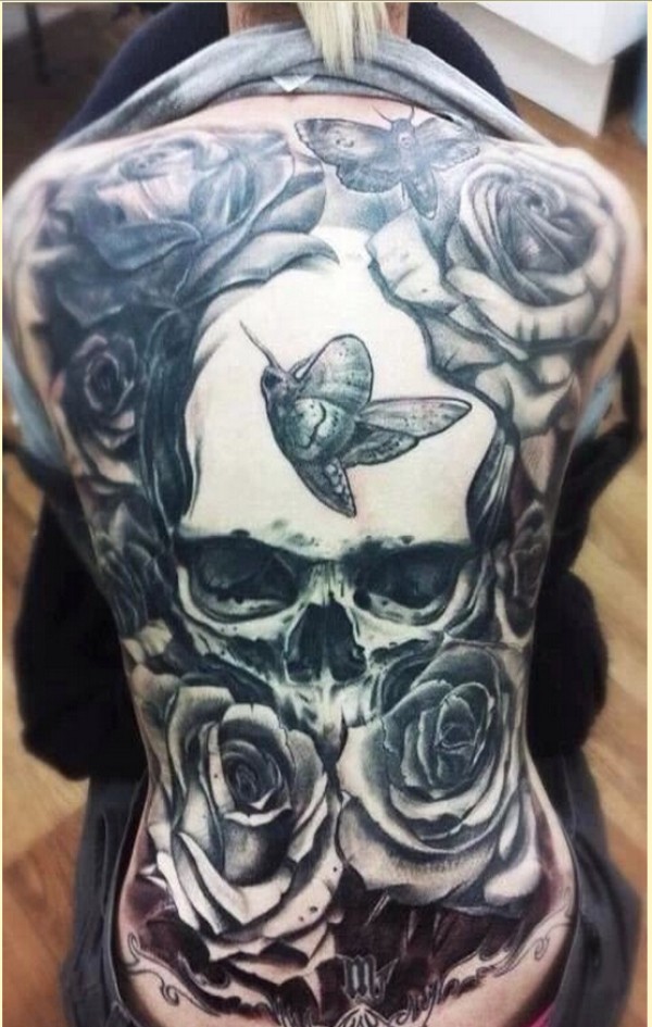 时尚性感女生满背玫瑰花骷髅头纹身图图片