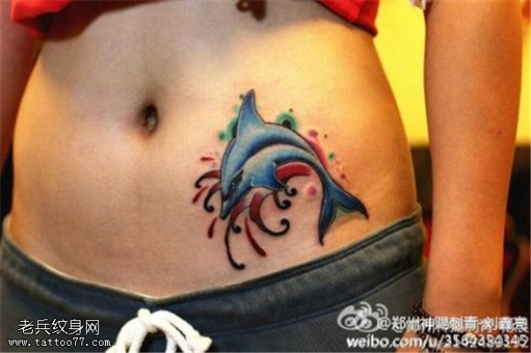 腹部彩色鲸鱼纹身图案