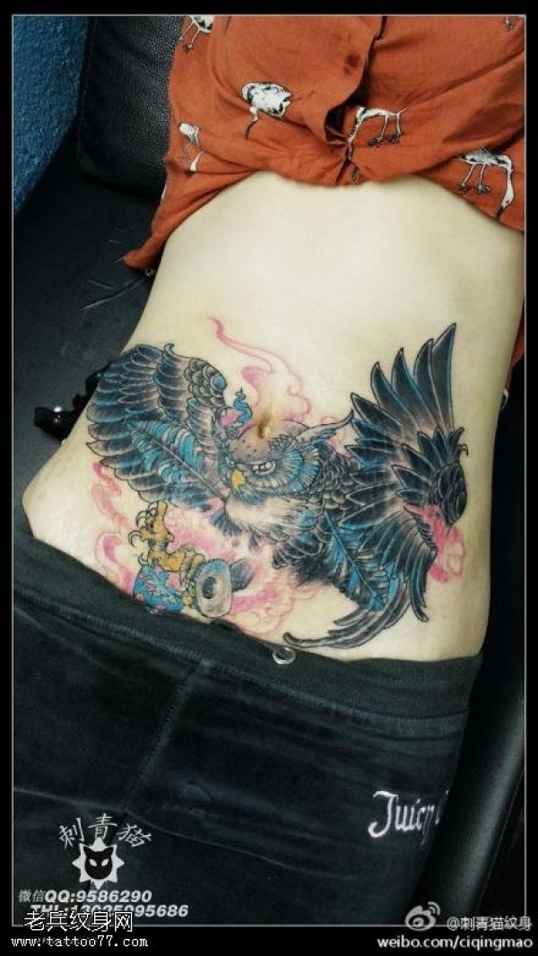 腹部彩色老鹰纹身图案