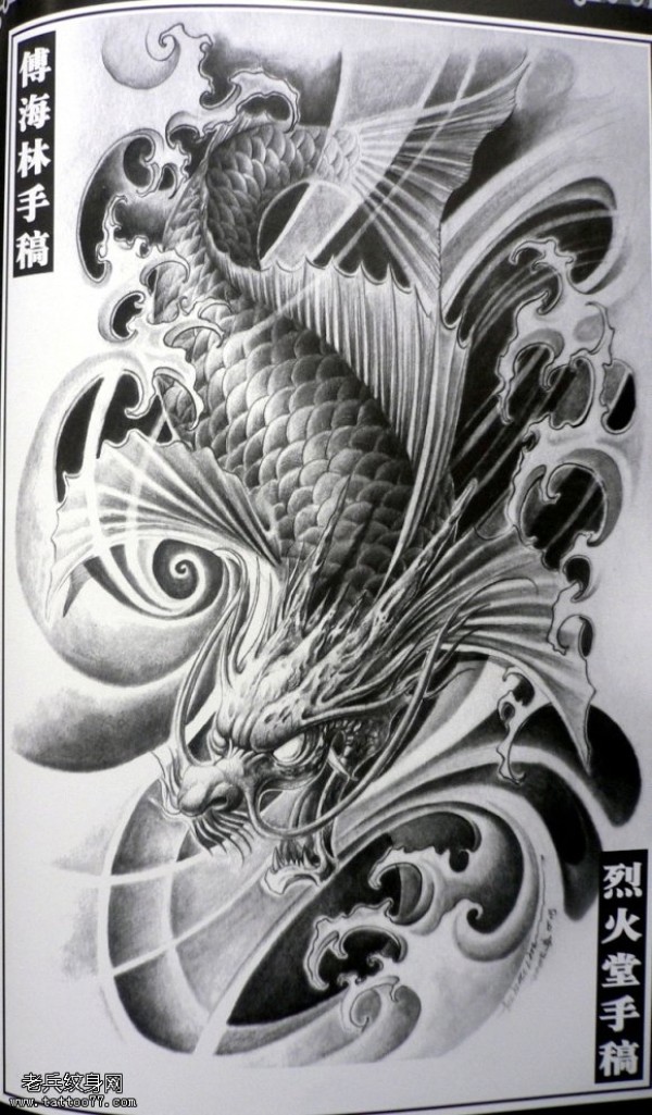 龙纹身手稿_一组老传统黑灰龙手稿纹身图案