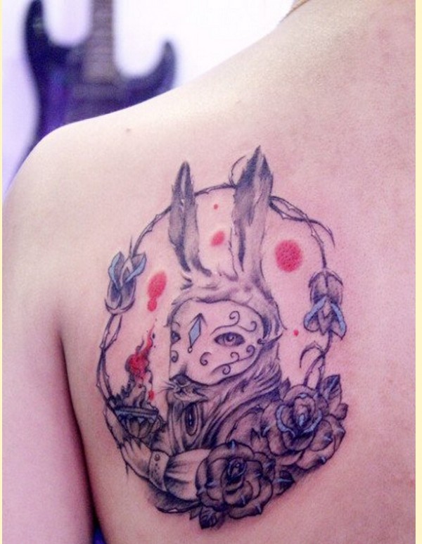 女生背部时尚好看的兔子玫瑰花纹身图图片