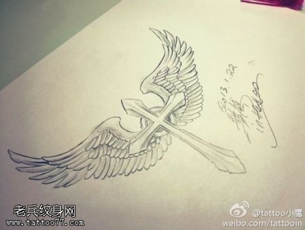 十字架翅膀纹身手稿图案