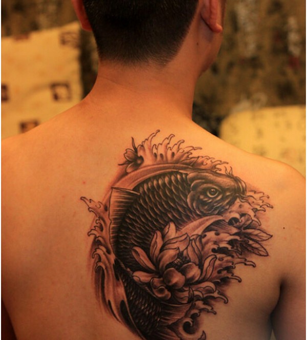 时尚男士背部个性好看的鲤鱼莲花纹身图片