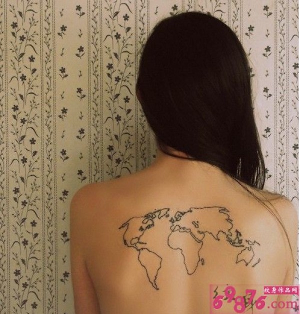 时尚美女背部个性世界地图纹身图片图片