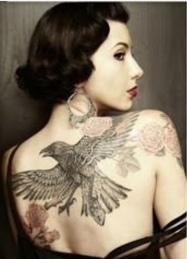 女生背部时尚个性好看的老鹰纹身