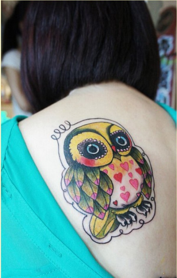 女生背部漂亮好看的彩色猫头鹰纹身图图片