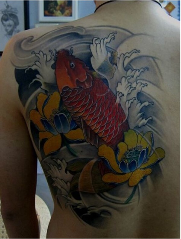 经典好看的背部鲤鱼莲花纹身图案 图片