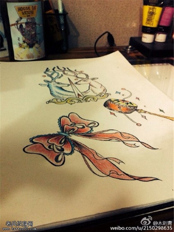 彩色蝴蝶结拨浪鼓纹身手稿图案